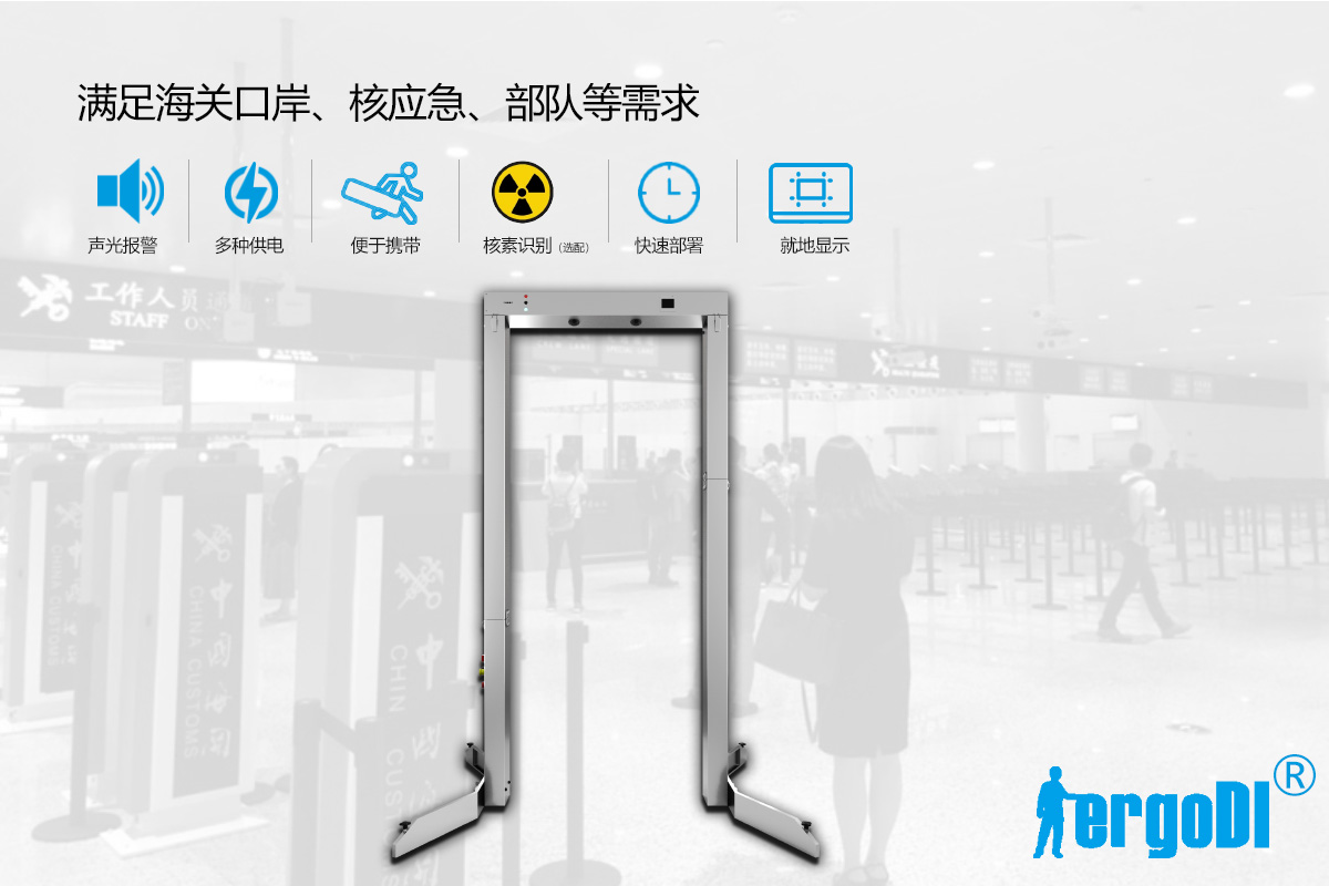 可折疊通道門可用于放射性監(jiān)測場所行人快速通過的檢測系統(tǒng),采用大體積塑料閃爍體探測器具有體積小,可折疊,便于攜帶。可用于干電池、鋰電池及市電供電,靈敏度高。誤報率低的特點,適用于海關、環(huán)保、核應急等特殊的放射性檢測場合。
